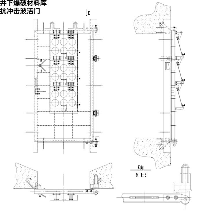 6、炸藥庫抗沖擊波活門向庫內(nèi)開啟,本設(shè)計采用向右側(cè)開啟,若需要向左側(cè)開啟,則應(yīng)以門扇中線為對稱軸,對稱變更各零件位置。